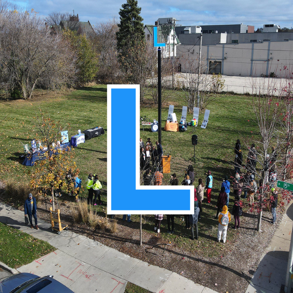 Residents from Lindsay Heights selected the letter “L” to stand proud in the neighborhood. Lindsay Heights is recognized as the first Eco Neighborhood, with a variety of green infrastructure and anchored by the presence of Walnut Way, Alice’s Garden, Fondy Park, and Ezekiel Gillespie pocket park as points of local pride. The Neighborhood Improvement District, activation events, and collaborations among church groups to bring healing, love, and light to the neighborhood.