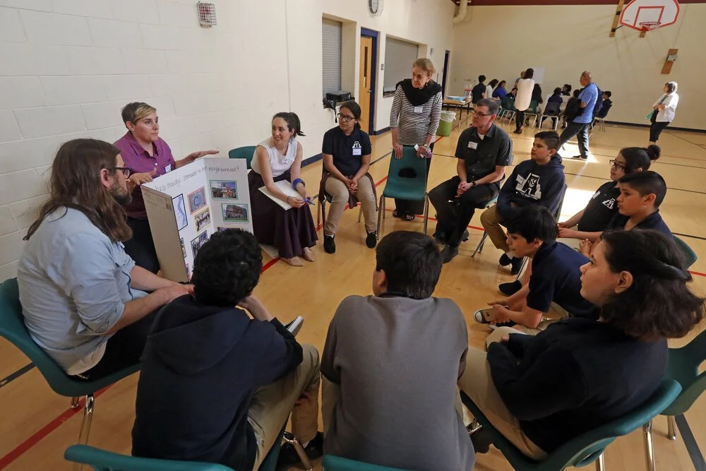 In May 2018, students and community gathered at UCC Acosta Middle School to share perspectives from three earlier neighborhood walks on water history, green infrastructure, and our urban relationship to water.